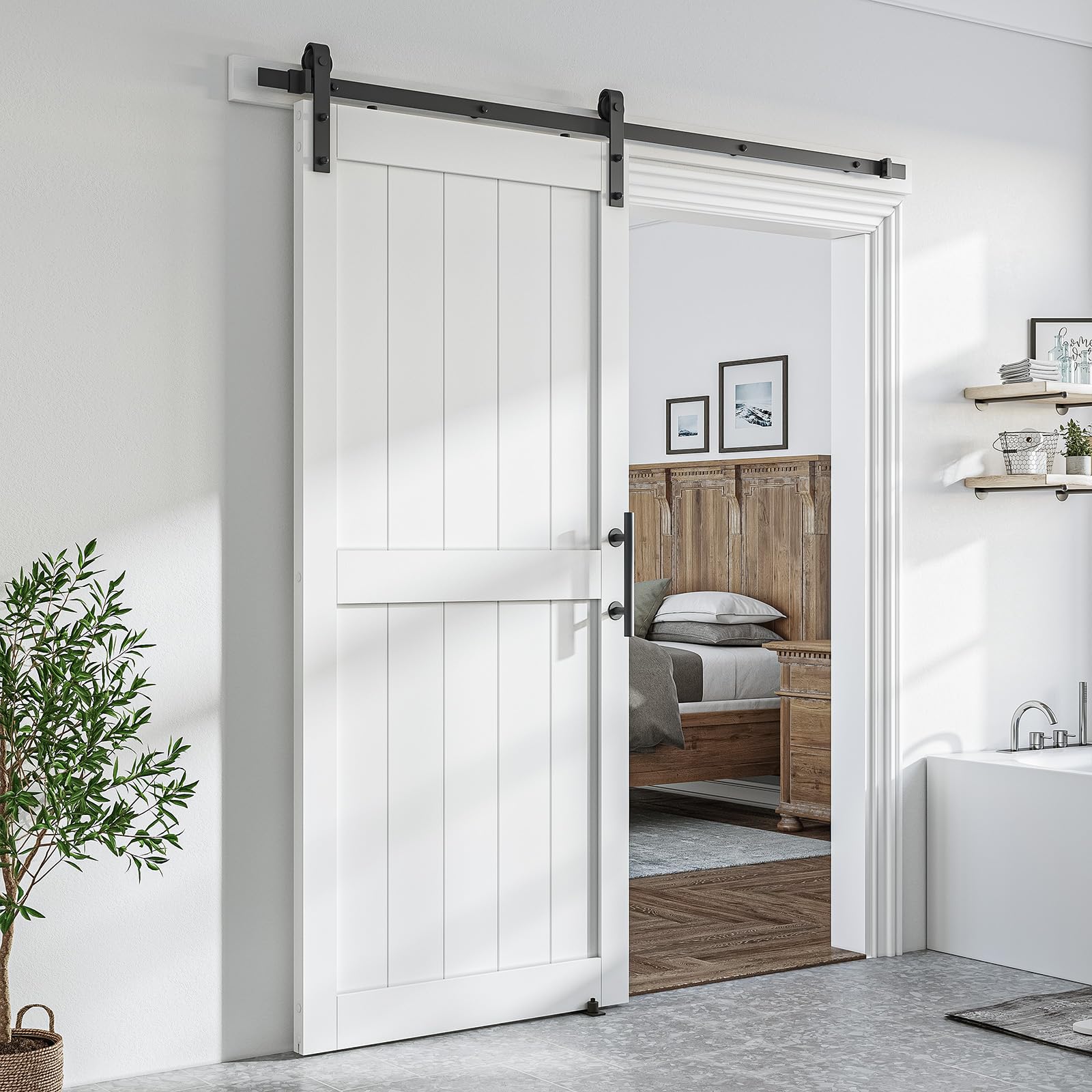 SmartStandard 36 x 96 inch White Sliding MDF Barn Door with 6.6FT Black Sliding Door Hardware Kit & Handle, Pre-Drilled Ready to Assemble, Waterproof PVC Coating, H-Frame